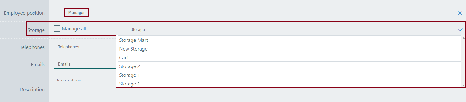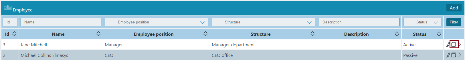 The Employee has the following sight. There are shown the Id, Name, Employee position, Structure, Description, Status.