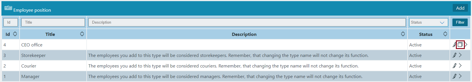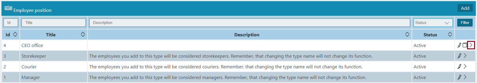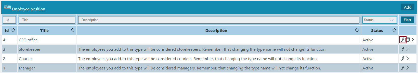 The Employee Position has the following sight. There are shown the Id, Title, Description, Status.