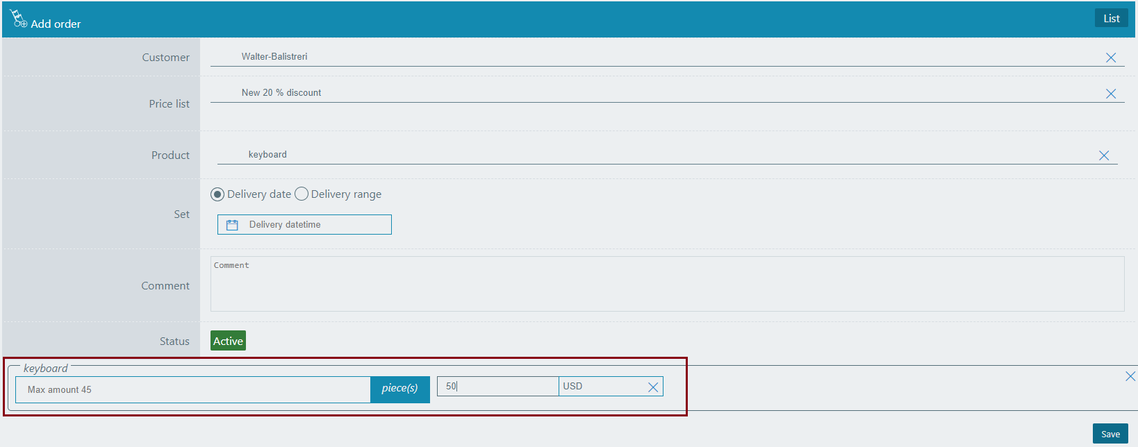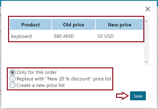 The first one will save the changes only for this order. The second one will save the changes in the current pricelist. And the third one will create a new pricelist, which you can use for connecting to another customer. Select the needed one and save.