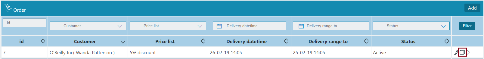 The Product Category has the following sight. There are shown the Id, Customer, Price list, Delivery datetime, Delivery range to, Status.