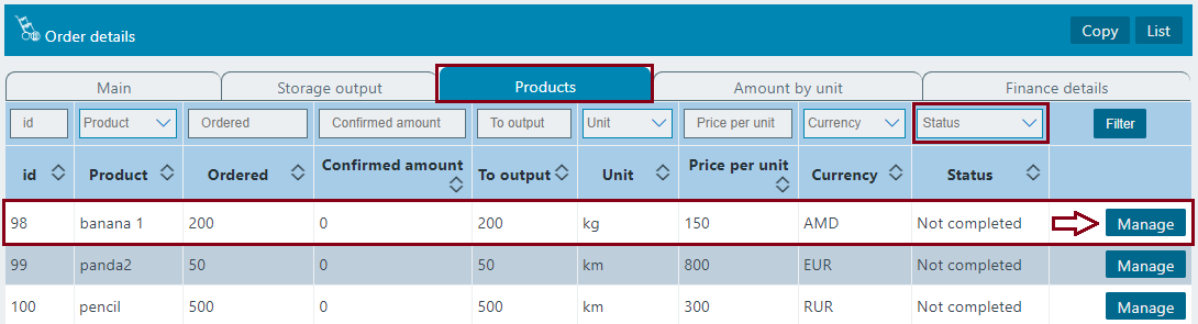 In the default table shows the products which output is greater than zero. To see products that are unfinished, you need to use the "Status" filter. Click to the "Manage" button. The user can manage the balance of the product in the order from the Order complete tab.