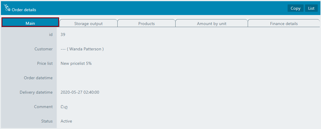Now let's take a look at the Order details page, its tabs and individual product management. To see the main info of the order, open the Main tab.