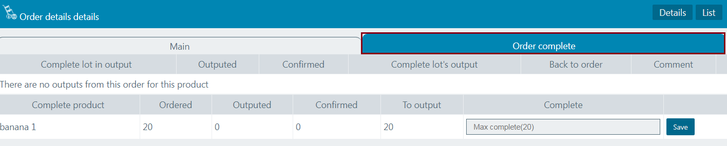 In this example shows that no order was issued for this product. However, the user can manage the amount of output of that product, even to 0.