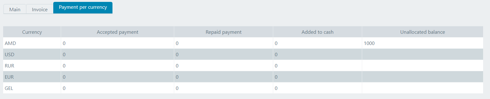 - Payment per currency - Show you how mush money has been recived for each of the currencies with the active status in the system, how mush of th debt has been repaid, and what balance has been added to the customer's cashbox.