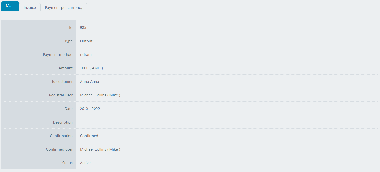 - Main - The main information the payment is shown here such as type, payment method, amount, partner or customer, registrar user, date, description, confirmation status and status.