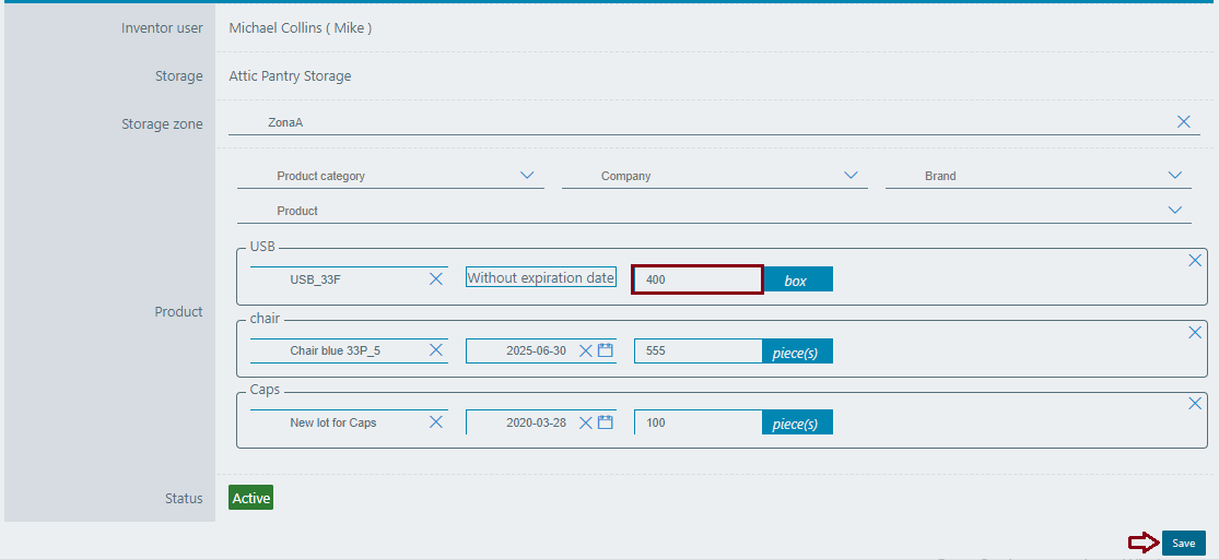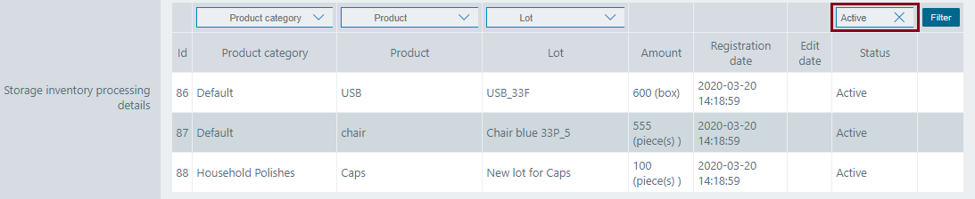 When you will click "Yes" you will be directed to the "Storage inventory details" page. Go to the details of the row you edited and find the "Storage inventory processing details". Let's filter the status to "Active" and the system will show you your new amount. See the picture.