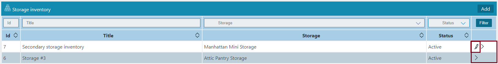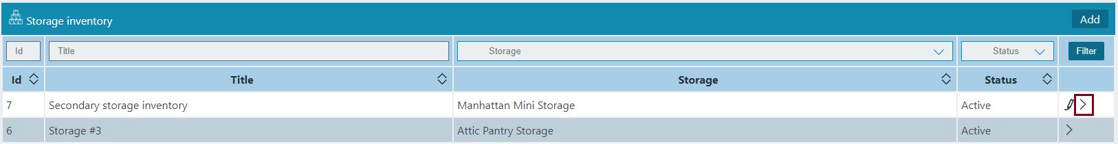 The Storage Inventory has the following sight. There are shown the Id, Title, Storage, Status.